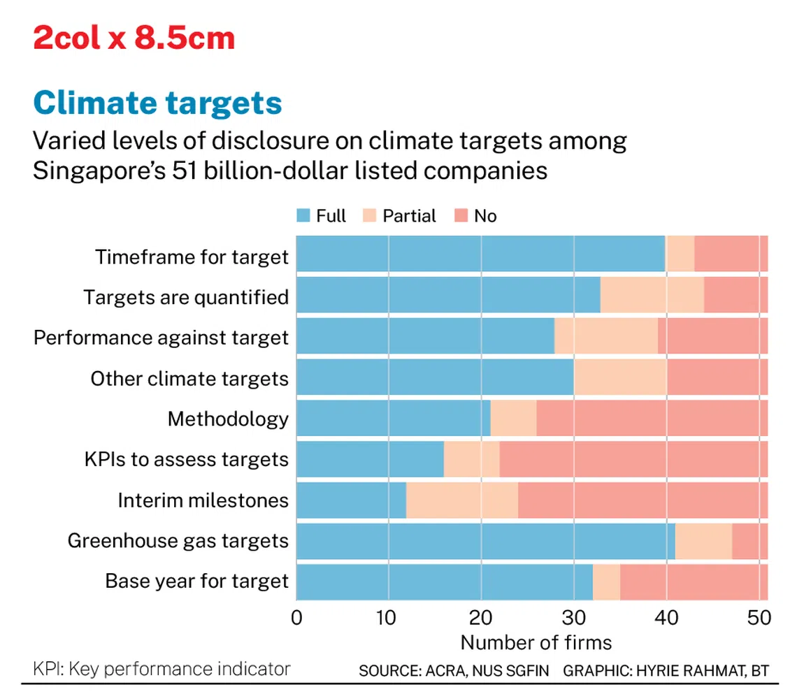 However, many have not disclosed the interim milestones towards achieving their targets, said the study by the Accounting and Corporate Regulatory Authority (Acra) and the National University of Singapore’s Sustainable and Green Finance Institute (SGFIN).