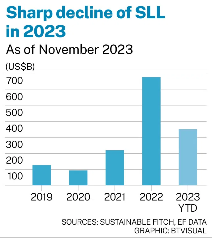 The SLL market fell sharply in 2023. The year-to-date value of SLLs structured as at November, in US dollars, was nearly 50 per cent lower than in 2022, data from news and analysis service Environmental Finance indicated. Higher rates and macro uncertainty may have deterred borrowing, especially from highly-leveraged companies.