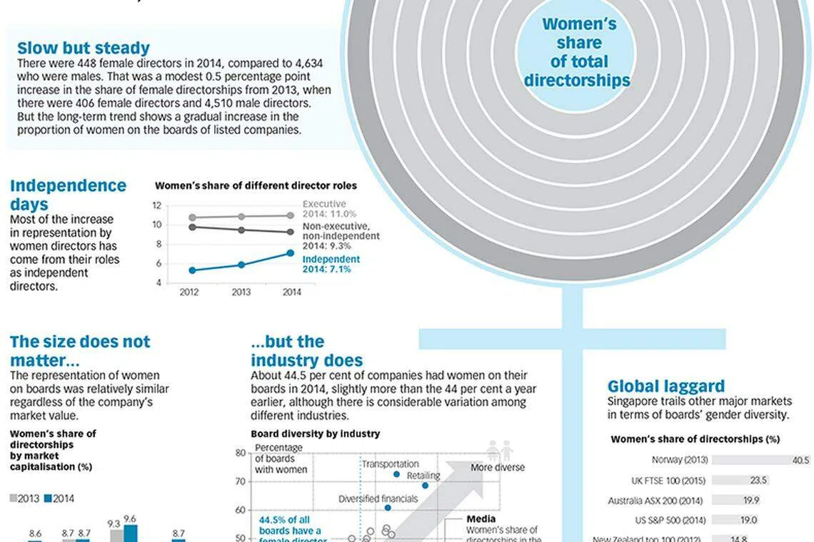 Woman on boardShareAdd BT as a preferred sourceAdd BT as a preferred sourcePublished Thu, Apr 16, 2015 · 09:50 PM READ MORE: Women directorships make some headway among S'pore firmsCorporate governanceBoard diversityInfographicsCopyright SPH Media. All rights reserved.Reuse this contentFeedbackDeeperDive is a beta AI feature. Refer to full articles for the facts. Learn moreTRENDING NOWAutobahn Rent A Car directors declared bankrupt over S$50 million each owed to DBSLoyang Valley sold for S$880 million to SingHaiyi-led consortiumNassim Road bungalow changing hands for S$64.9m In taxing wealth, how far can Singapore push property owners?