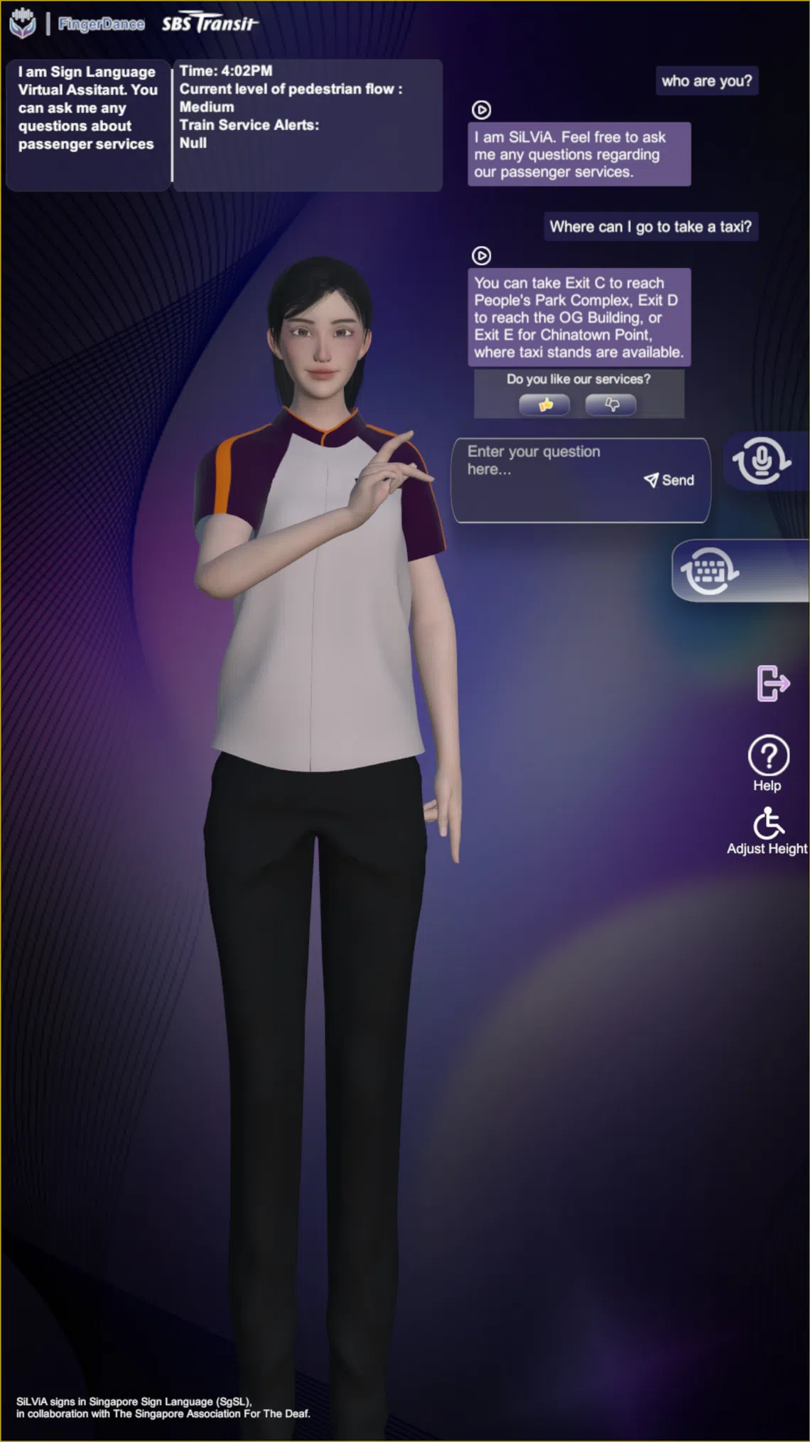 Developed with partner FingerDance Pte. Ltd, in collaboration with the Singapore Association of the Deaf, Silvia also delivers culturally nuanced translation of station announcements.