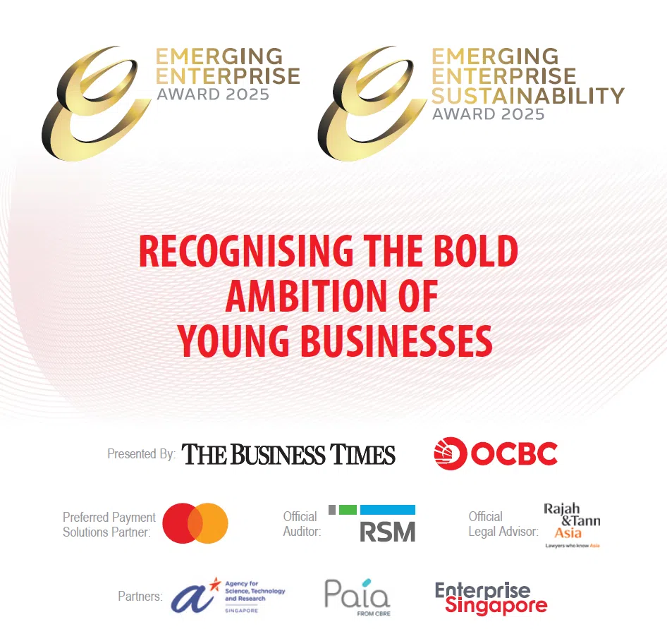 The Emerging Enterprise Awards is jointly organised by The Business Times and OCBC. It is supported by the Agency for Science, Technology and Research, Enterprise Singapore, Mastercard, Paia Consulting, Rajah & Tann Asia and RSM Singapore.
