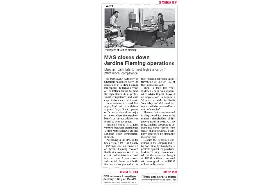 A test case emerged in 1984 when Jardine Fleming (Singapore), then-jointly owned by Jardine Matheson Holdings (JMH) and Robert Fleming & Co of London, was alleged to have committed gross mistakes in its advisory work for at least two major corporate transactions here. In an unprecedented move, the Monetary Authority of Singapore (MAS) revoked the merchant banking licence of Jardine Fleming, citing lack of professional competence and care in its work. The merchant bank was taken to task particularly for overvaluing Straits Steamship when advising Keppel Shipyard in its S$400 million takeover of Straits Steamship.