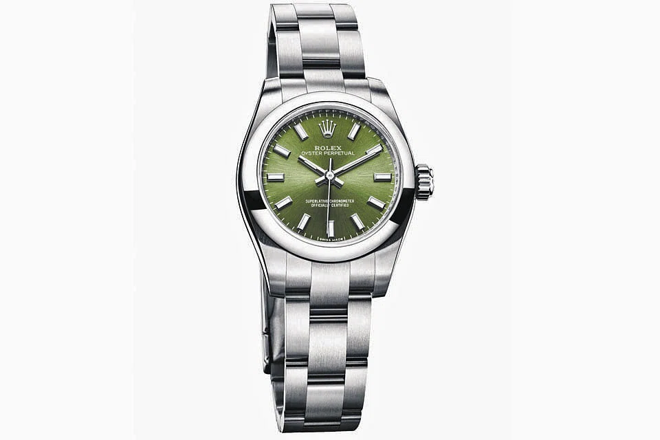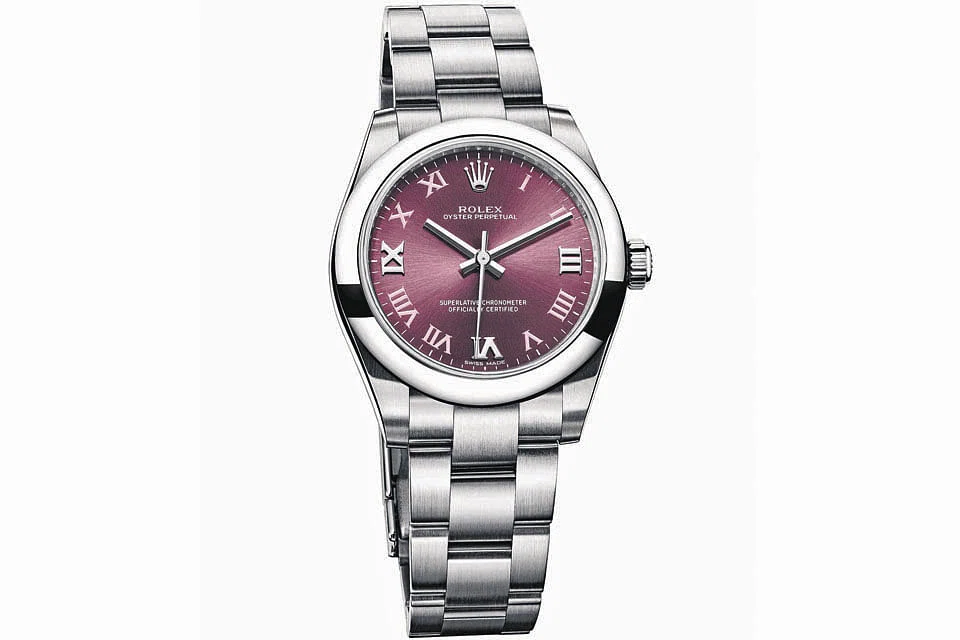 At the same time, new dials in different colours were added to the watch - red grape, olive green, champagne and dark rhodium. While these extend the many sizes and colours that have been introduced to the Oyster Perpetual over the years, some things in the timepiece never change: the stainless steel Oyster case which is waterproof to a depth of 100 metres; the watch has no other function than a reliable and accurate time display; and a certified Swiss chronometer movement.