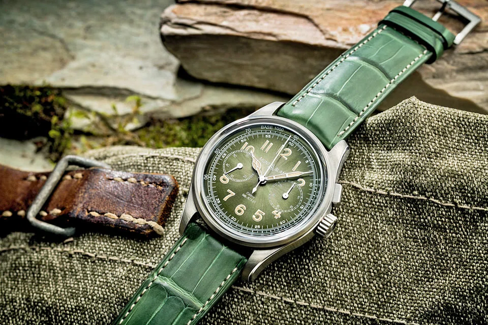 The caseback of the bronze model is coated with titanium to avoid allergies. The dial is in smoked champagne colour with sun-ray finishing, providing an elegant backdrop for the bicompax counters at three and nine o'clock. The counters are inspired by Minerva's historic chronographs.