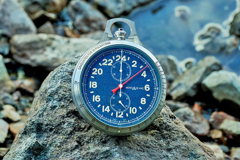 The Montblanc 1858 Pocket Watch Limited Edition 100 honours Minerva's 160th anniversary. Capped at 100 pieces, the chronograph pocket watch is designed for mountain explorers. It can be positioned on a table with a stand, or combined with an in-built compass. The compass can be assessed by opening the watch up to lay flat on a map.