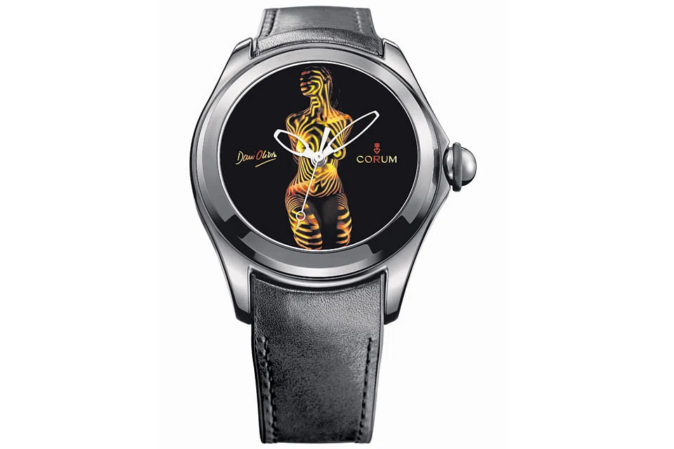 In a tie-up which started last year, Corum has miniaturised Olivier's art, transporting two of his most distinctive photos onto a watch dial. Olivier's portraits are real photos - not the result of digital manipulation. He accomplishes the effects by projecting light patterns onto naked bodies set against a jet-black background, creating completely surreal forms.