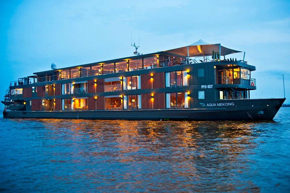 I am on a three-night cruise on the Aqua Mekong, which takes me from Phnom Penh, Cambodia to My Tho, Vietnam, a port just 90 minutes from the buzzing metropolis of Ho Chi Minh City. The intimate, ultra-luxurious vessel is best described as a floating boutique hotel, boasting just 20 staterooms with California king-sized beds, spread over two decks. All are exactly the same 30 square metres in size, but configured in two ways: with a balcony like mine, or in its stead, an expanded bedroom with floor to ceiling windows presenting eye-level, panoramic views of the river and its banks. Some rooms can even be combined, with one side converted into a living room to create one-bedroom suites with his and hers bathrooms.