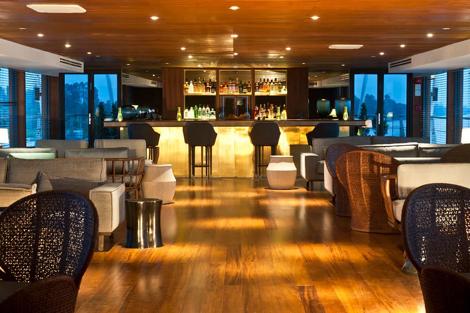 Outside of my private quarters, I could find all the premium trappings befitting of the ship's lofty billing: a gym and an outdoor plunge pool with cabanas on the observation deck; a screening room furnished with sumptuous Eames lounge chairs stocked with a curated collection of classic films on this exotic region such as The Scent of Green Papaya, The Quiet American and Good Morning, Vietnam; a further outdoor cinema; and a library and games room replete with novels and a foosball table to while away the languid afternoons. In the evenings, I would find myself heading to the elegant teak floor lobby lounge to grab a drink. They come with beguiling names such as Kampong Old Fashioned and Night Market Sangria.