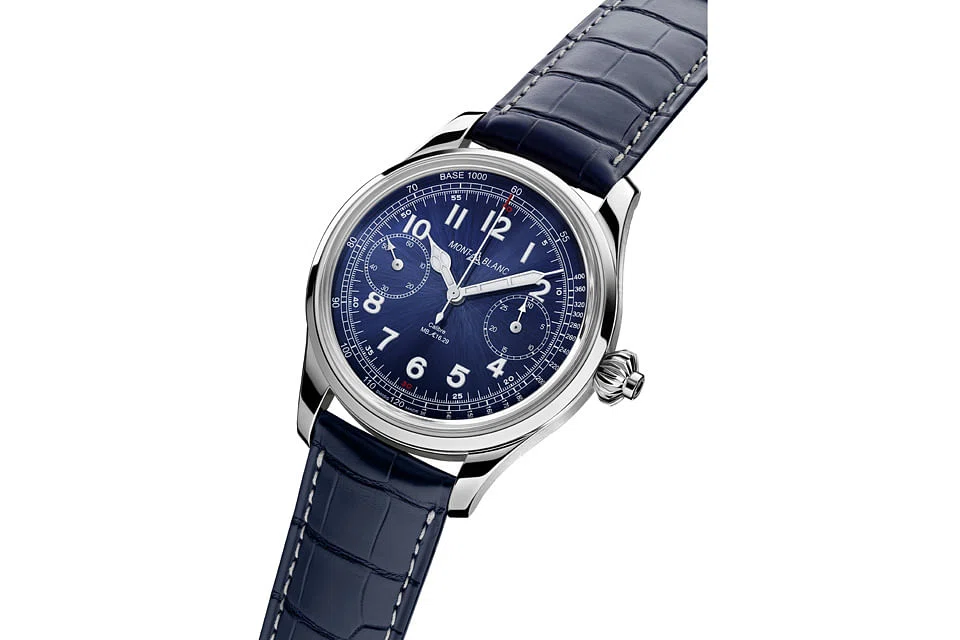 Chronographs produced in the 1930s by the Minerva watchmaking house were models of accuracy in timekeeping. They also provided the inspiration for this watch. Even in the design and look, the early models exerted an influence: the historical shape of the hands of the remake, its small seconds at 9 o'clock and the chronograph counter at 3 o'clock. These are set against a striking blue dial held in a 44mm case. The hand-wound movement which powers the watch was developed in-house by Montblanc, which now owns Minerva.