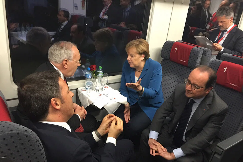German Chancellor Angela Merkel, French President François Hollande, Italian Prime Minister Matteo Renzi and Austrian Chancellor Christian Kern all came to southern Switzerland to join Swiss Federal President Johann N Schneider-Ammann on June 1 to attend an opening ceremony featuring dancers, acrobats, singers and musicians celebrating Alpine culture and history.