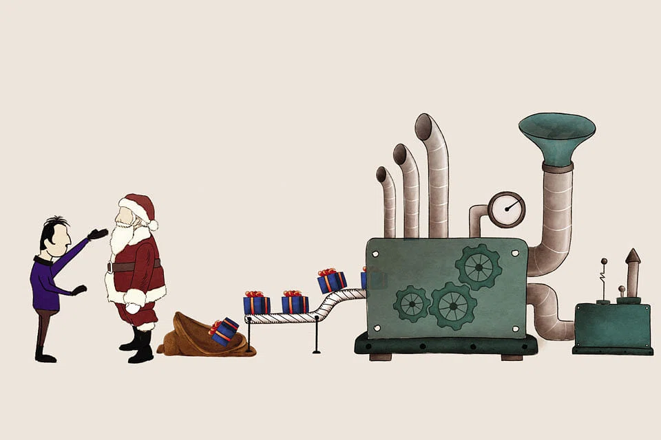 But instead of solving Santa's Productivity pains, The machine sputtered and failed Why, the elves could not explain
