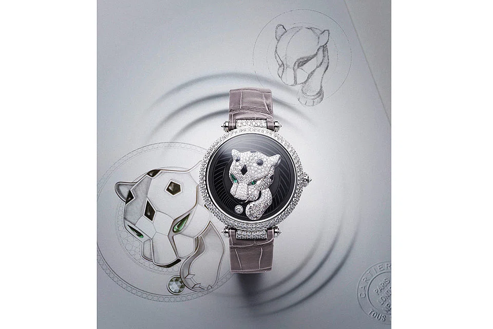 Cartier pioneers a fiery new technique in watchmaking in the Ronde Louis Cartier XL flamed gold timepiece. The Panthere Royale watch transforms platinum and diamonds into glittering lacework in a dazzling showcase of the creativity of Cartier jewellery. In the Panthere Joueuse (price upon request) complication timepiece, Cartier makes a game of telling the time in depicting a panther playing with a ball.