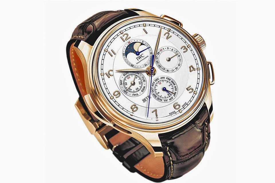 And it got its name from the two customers, who were businessmen from Portugal. The Portugieser, built in a 43mm case to accommodate a larger pocket watch movement, was deemed too big and unfashionable. Its key design elements were a streamlined dial with Arabic numbers, a very thin bezel that makes the watch look even bigger, leaf hands and a large sub dial at 6 o'clock for the seconds.