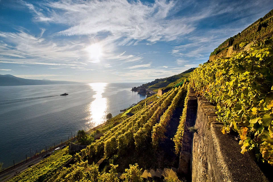 The Lavaux Vineyard Terraces with great scenic splendour and views of Lake Geneva and the Alps is another Unesco heritage site in Switzerland. This is one of the country's largest wine-growing areas (2,050 acres) nourished by the triple effect of solar rays: direct sunlight, the sun reflected by the lake and the warmth stored in the terraced walls.