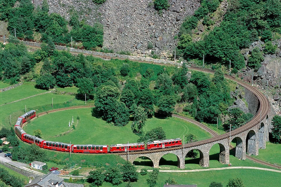 The Albula/Bernina line of the Rhaetian Railway is said to be one of the most spectacular in the world. It combines breathtakingly beautiful Alpine landscape with a route which winds its way through twisting tunnels and over towering viaducts - a legendary feat of remarkable engineering.