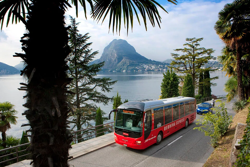 From Lake Geneva the journey continues to Martigny, Brig and Zermatt, then by the Glacier Express to Chur and St Moritz. From this famous Alpine resort there are two ways to travel to Lugano - in summer by Bernina Express and Bernina Express Bus; and in winter by Palm Express (PostBus). From Lugano, the round tour goes first to Lucerne and then back to Zurich.
