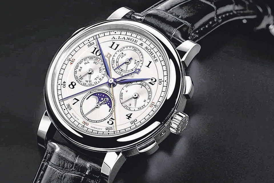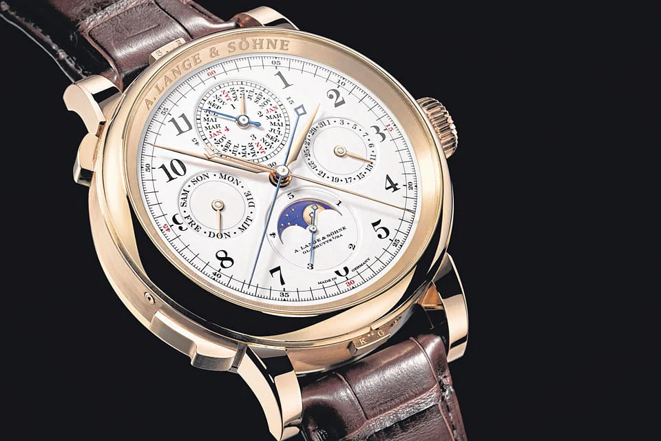 2013 -Grand Complication. Lange's most complicated creation. It features seven complications: a split-second chronograph with a minute counter and flying seconds; a chiming mechanism with a grand and small strike; a minute repeater; and a perpetual calendar with a moonphase display.