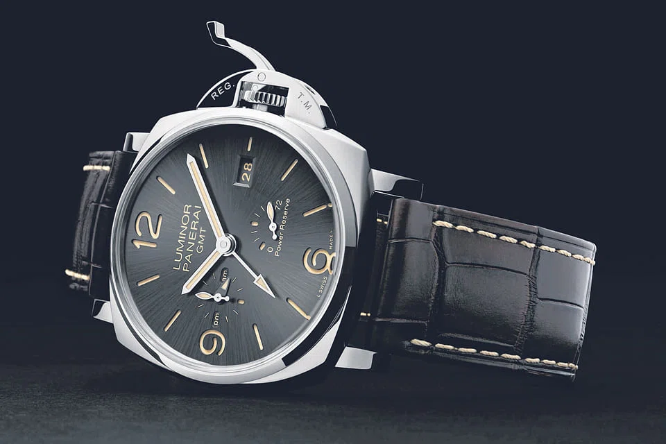 The Luminor Due 3 Days Automatic (PAM00943) and the Luminor Due 3 Days GMT Power Reserve Automatic (PAM00944) both have a power reserve indicator. In the first watch, it's circular and found on the back of the watch. The power reserve indicator is located on the dial at 5 o'clock in the second watch, which also has a GMT function with day and night indication that tells time in a second time zone. The seconds and 24-hour indicator is at 9 o'clock.