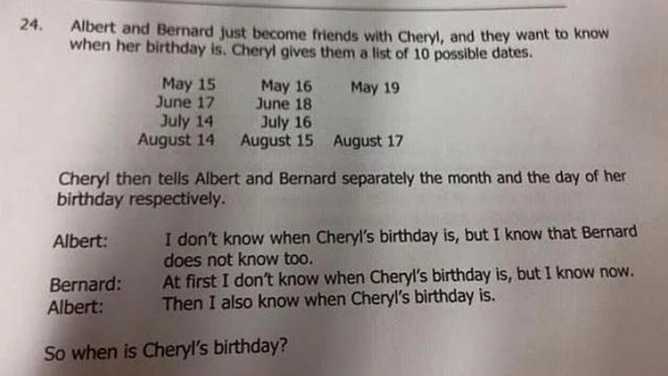 Cheryl then tells Albert and Bernard separately the month and day of her birthday respectively, because she can't just conceal her birthday on Facebook like a normal passive-aggressive person. You know, the kind who gets upset when you wish them "Happy birthday" because they don't want to be reminded of getting older, but pouts when you don't say anything about their birthday?