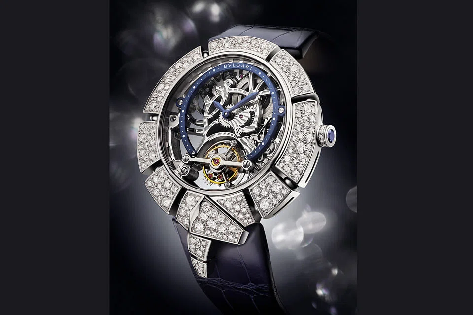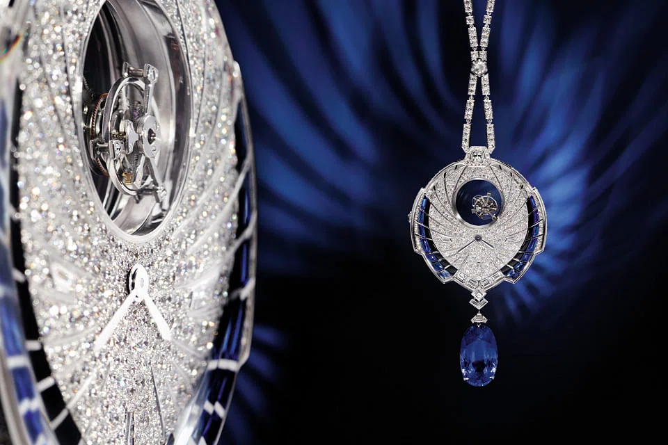 Cartier, also a high-jewellery house, continued to turn out sparkling timepieces. Among them is the exclusive Tourbillon Mysterieux Azure, a gem-set pendant double tourbillon watch.