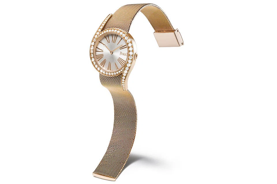Piaget, another jewellery and watch name, has introduced the Limelight Gala. You can tell the model by its round case with two dainty elongated lugs. First launched in the 1970s, the Limelight Gala now appears in gold with a Milanese mesh strap.