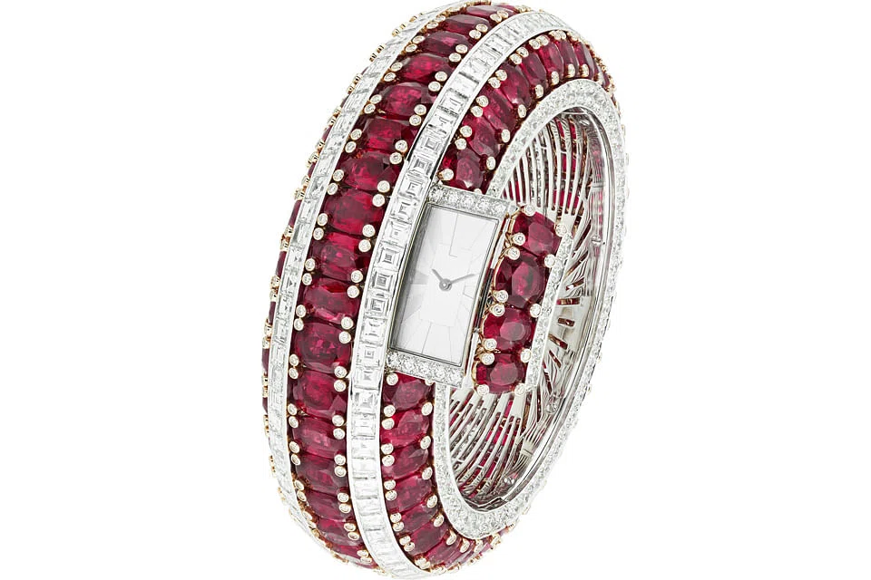 Another one-of-a-kind creation unveiled this year is Van Cleef & Arpels' Rubis Secret Bracelet Watch, which is set with 115 high-quality Mozambique rubies weighing a total of 151.25 carats. This bracelet timepiece is a work of unparalled precision and intricacy as well as constant technical inventiveness. It has taken more than a year to finish.