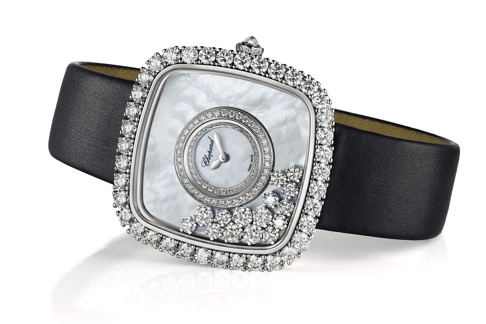Chopard, also a watch brand strong in jewellery, celebrates the 40th anniversary of its popular Happy Diamonds collection by recreating the very first Happy Diamonds timepiece - this time for the ladies. Many may be surprised that this women's watch line made its debut with a man's watch. The new version, in a limited edition of 150 pieces, retains the cushion-shaped white gold case of the original but is smaller, and its dial is in white mother-of-pearl instead of black.