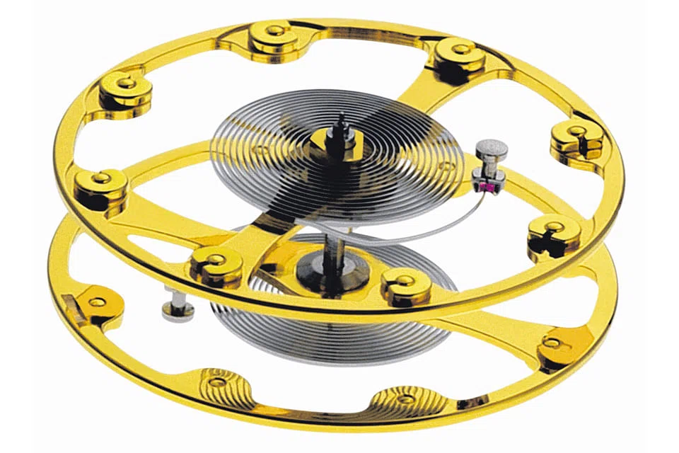Unlike a stationary pendulum clock, the ever-moving wristwatch is subject to the effects of gravity, motion, temperature changes and all manners of shocks which can upset the working of the watch. The double balance wheel, along with a double balance spring, will tackle these disturbance.