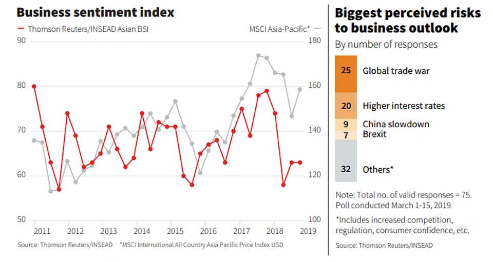 Confidence among Asian companies held near three-year lows, hastened along its downward path by the US-China trade dispute, according to the latest Thomson Reuters/INSEAD Asian Business Sentiment Index.
