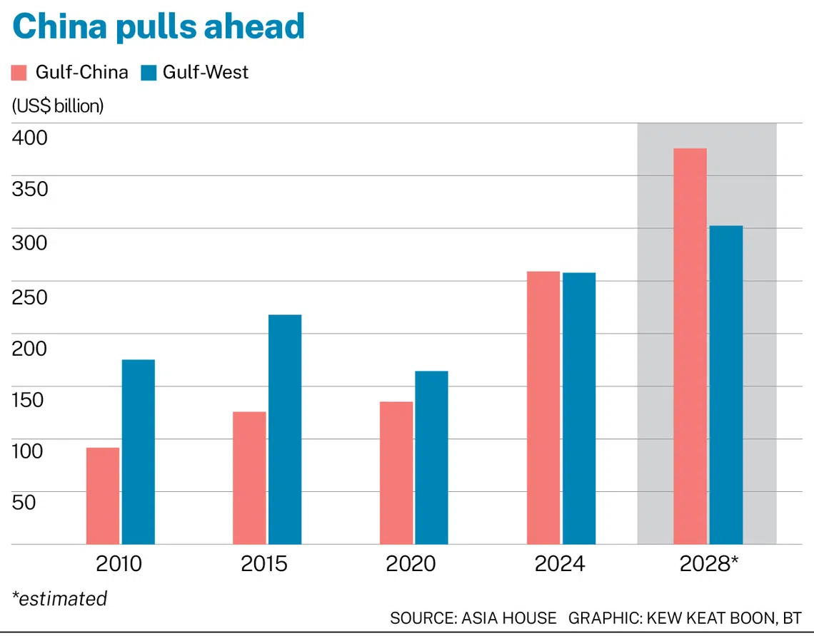 [SINGAPORE] For the first time, China’s trade with the Gulf surpassed the combined total that Western powers – the US, UK and the eurozone – ship to the Arab states. This watershed moment last year came ahead of expectations, underscoring the eastward drift of global economic activity, said Asia House.
