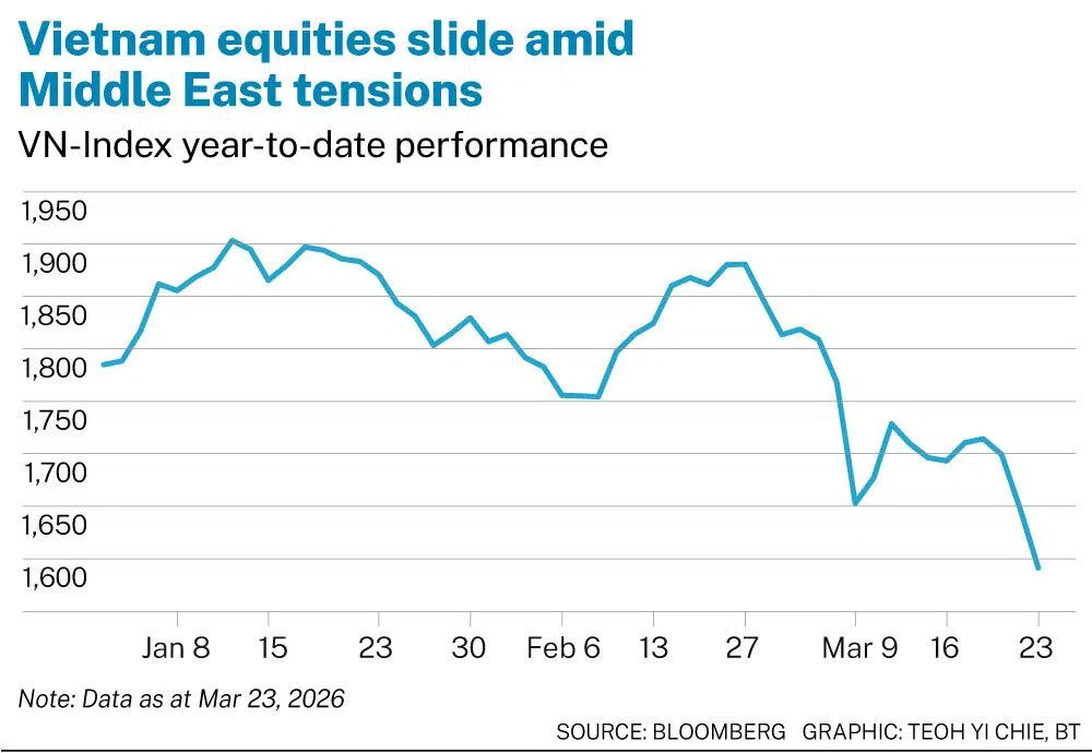 As at market close on Tuesday (Mar 24), the benchmark VN-Index had dropped 14.1 per cent from the beginning of March and was down 9.5 per cent for the year, reflecting a sharp deterioration in sentiment as investors grapple with rising global uncertainties and a surge in energy prices.