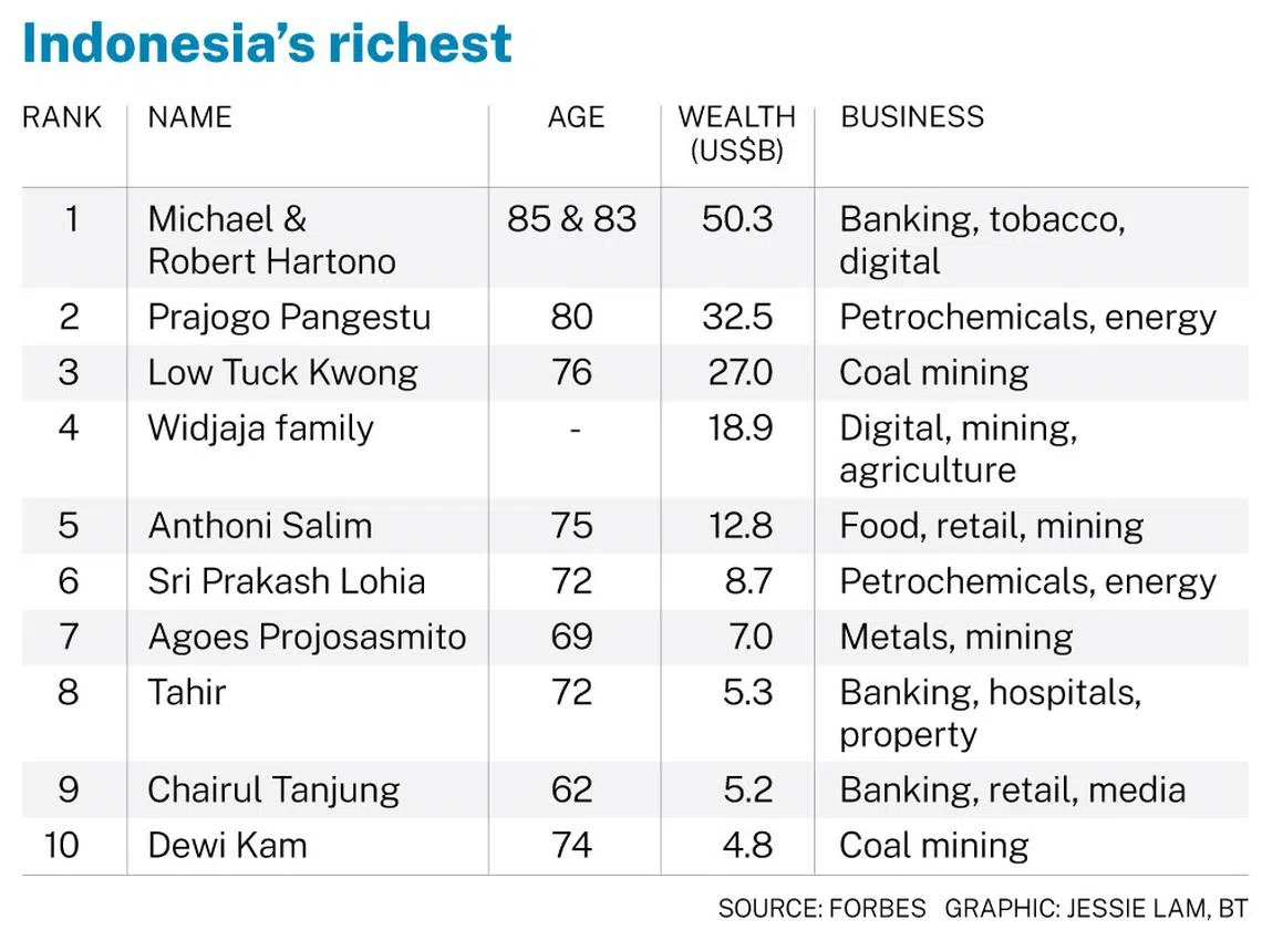Hartono brothers lead with US$50.3 billion, followed by petrochemicals and energy tycoon Prajogo Pangestu, coal magnate Low Tuck Kwong, the Widjaja family of the Sinar Mas Group, and Anthoni Salim