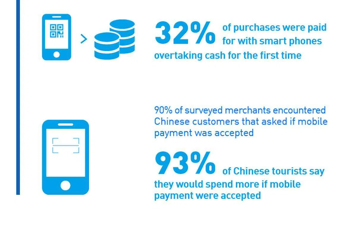 The study, which surveyed 2,806 Chinese travelers, found that outbound Chinese tourists made more mobile transactions compared with cash payments for the first time. Although the bankcard is still the most popular payment method among Chinese tourists, this year saw an increase in the share of mobile payment transactions. On their most recent travels overseas, Chinese tourists surveyed paid for 32 per cent of transactions with mobile phones, overtaking cash for the first time, which was used only 30 per cent of transactions.