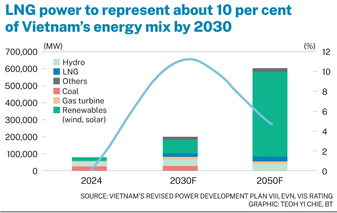 Under Vietnam’s revised Power Development Plan VIII (PDP8) approved in April, LNG-to-power capacity is targeted to reach 22.5 GW by 2030, from less than 1 GW today, accounting for roughly 10 per cent of the country’s power mix.
