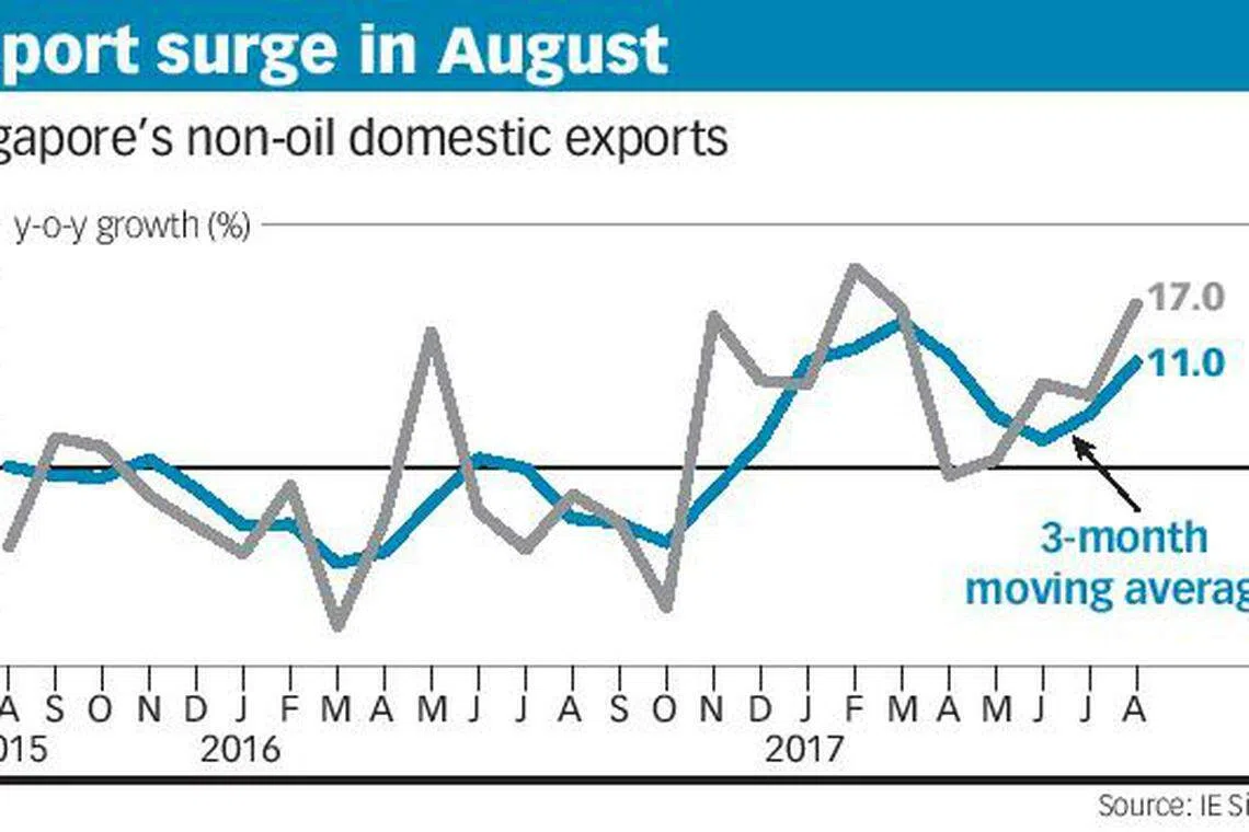 OCBC Bank's Selena Ling estimated that the NODX increased 9.9 per cent in the first eight months of the year. IE Singapore expects the NODX to rise 5 to 6 per cent in 2017.
