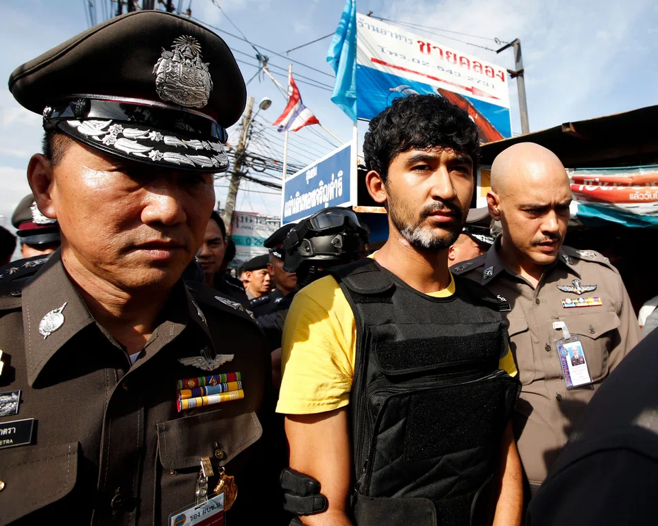 "This is the area where he met the man in a yellow shirt to exchange the backpack," national police spokesman Prawut Thavornsiri told reporters as the suspect, Yusufu Mieraili, was led on a re-enactment of his movements outside a Bangkok railway station.