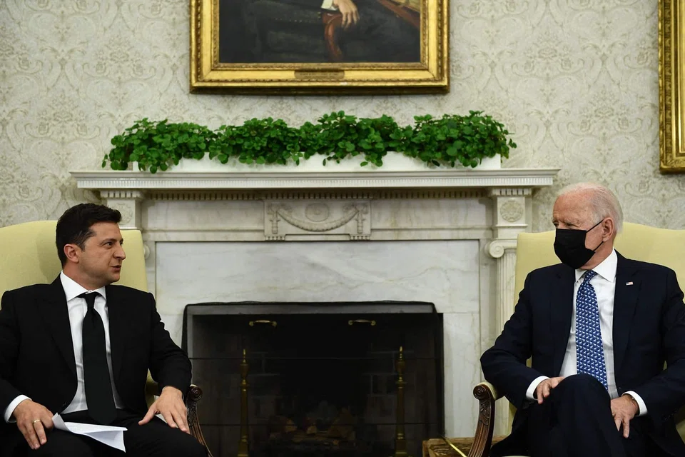 [WASHINGTON] US President Joe Biden spoke at length on Sunday with Ukrainian counterpart Volodymyr Zelensky about Russia's military buildup along Ukraine's borders, with the pair committing to pursue "diplomacy and deterrence," the White House said.