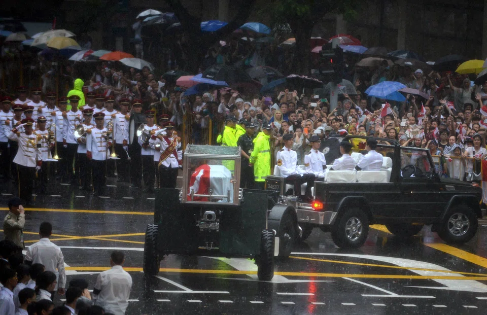 As the cortege of Singapore's first prime minister Lee Kuan Yew began the funeral procession at 12.30pm under pouring rain, scores of people - most dressed in black, many wearing black ribbons, others clutching or waving the national flag - bid the country's founding father a final farewell.