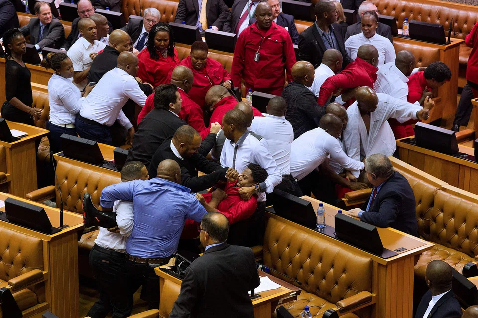 [CAPE TOWN] A brutal fistfight broke out in the South African parliament Tuesday as security guards ejected opposition lawmakers in an ugly fracas that underlined heightened political tensions over Jacob Zuma's presidency.