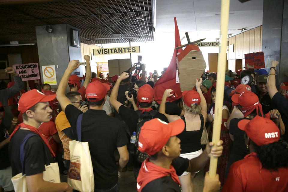 In Brasilia, police dispersed protesters from an action by landless farmers, who tried to storm the Ministry of Agriculture, scrawling graffiti on walls that read "Agribusiness kills."