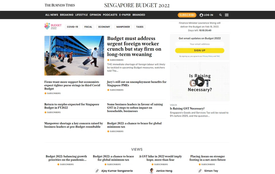 The Business Times readers can already access a dedicated micro-site at bt.sg/budget22 to get the latest coverage and the most up-to-the-minute alerts - including a live blog, breaking news and interactive graphics on Budget Day.