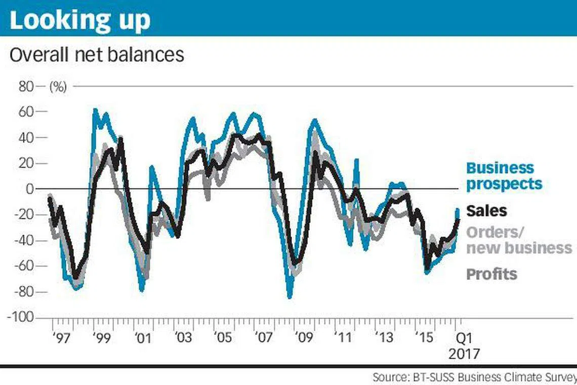 Business activity in Q1 2017 strengthened almost across all types of firms, with widespread improvements in all four indicators, the BT-SUSS survey showed.