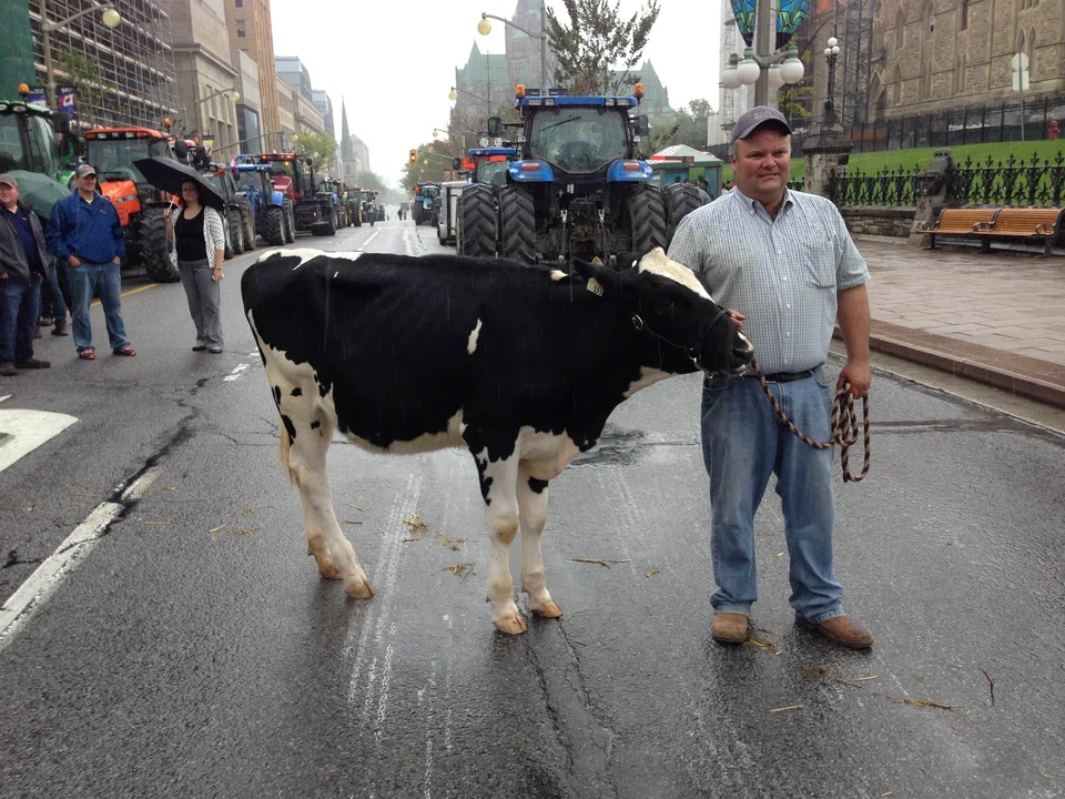 The protesters representing 12,234 family farms across Canada said they fear opening up the Canadian market to foreign milk imports will harm their supply-managed industry.
