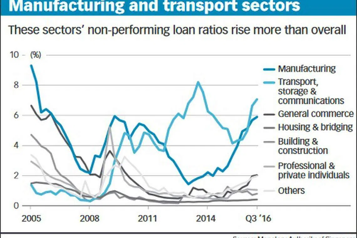 Beyond the oil-and-gas sector, the manufacturing, as well as transport, storage and communications (TSC) sectors were flagged in MAS's report. NPL ratios of the latter two sectors rose to 5.9 per cent and 7.1 per cent in Q3 2016 respectively.