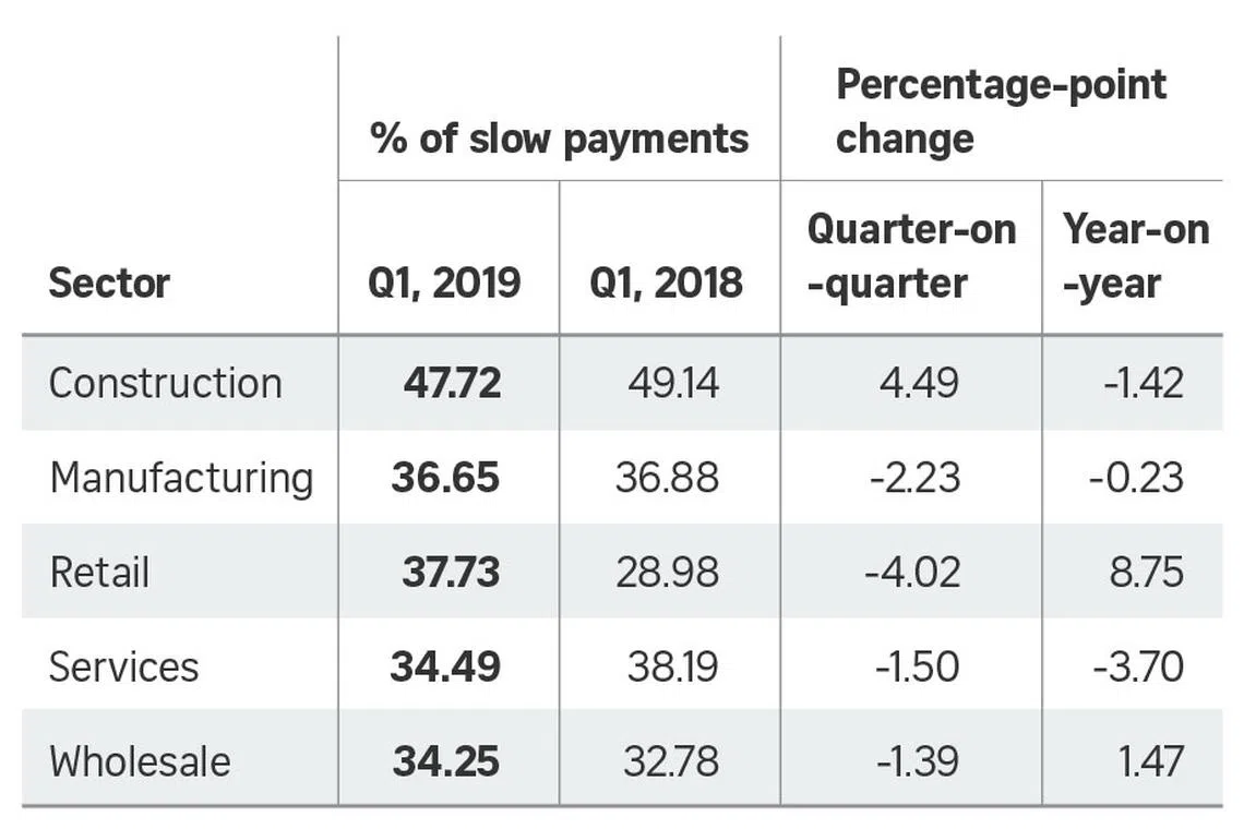 She added: "With the exception of the construction sector which has seen worsening debts from the previous quarter, the remaining sectors have experienced a decrease in slow payments. However, compared to the same quarter in 2018, we have noted a slight increase in payment delays. This could be attributed to tightening cashflows and a generally dimmer outlook among firms here."