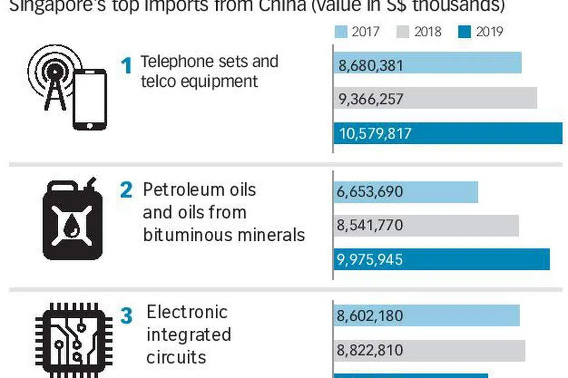 According to data from Enterprise Singapore, China's merchandise exports to Singapore for 2018 were S$68.0 billion and S$70.4 billion in 2019. Meanwhile, merchandise imports were S$67.0 billion in 2018 and S$66.9 billion in 2019.