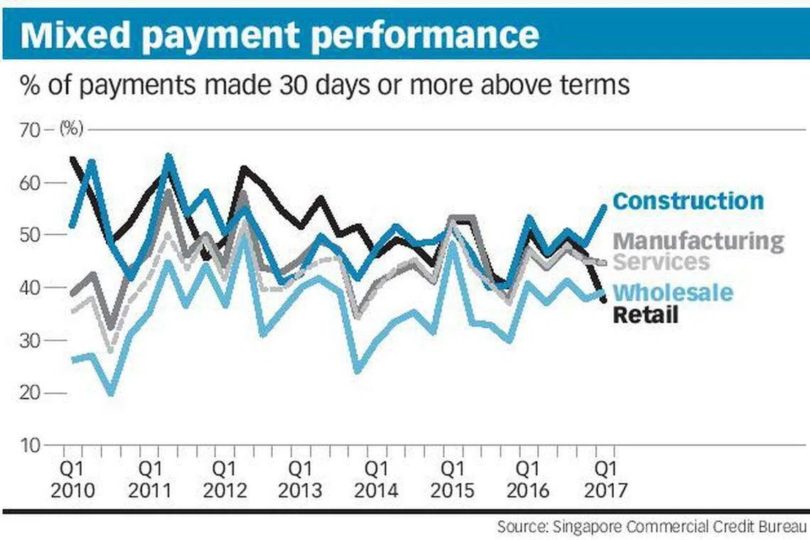 Slow payments by the construction sector in Q1 2017 jumped to 55.22 per cent, up from 47.97 per cent in Q4 2016, said the Singapore Commercial Credit Bureau on Tuesday.