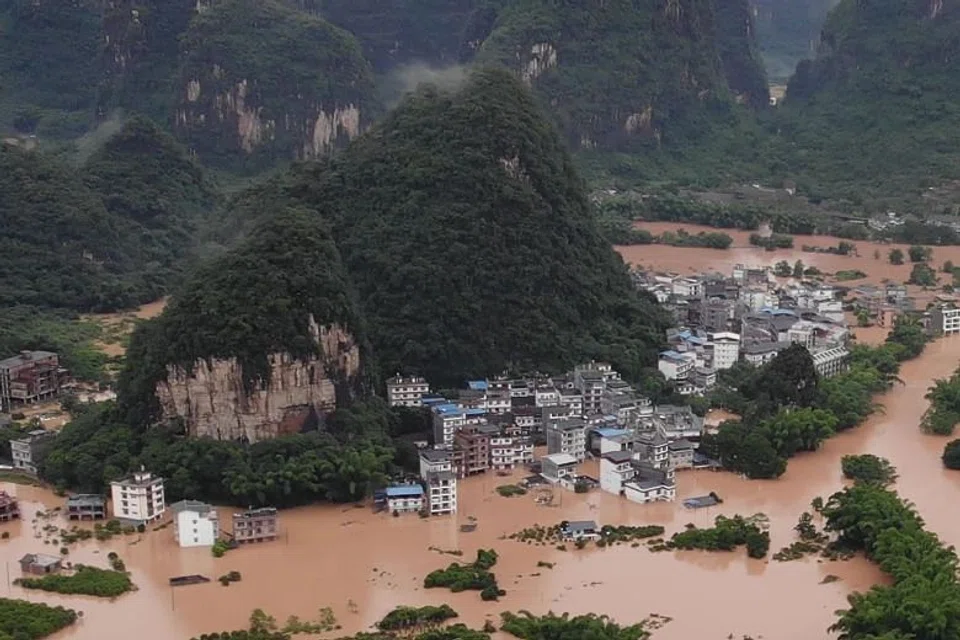 Streets were waterlogged in popular tourist destination Yangshuo, forcing residents and visitors to evacuate on bamboo rafts.