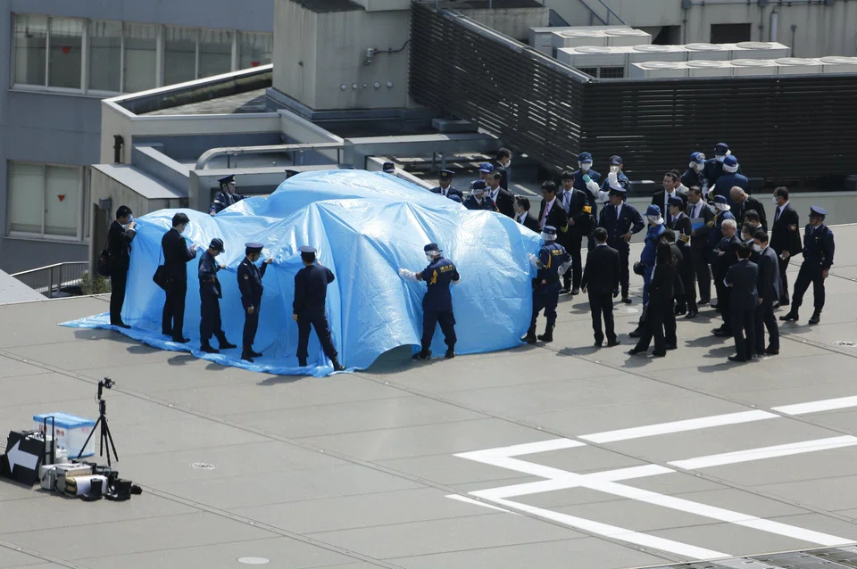 [TOKYO] A drone carrying a small camera, a water bottle and a flare and marked with a radioactive sign was found on the rooftop of Japanese Prime Minister Shinzo Abe's office on Wednesday, media reported.