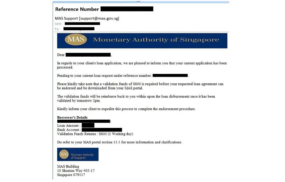 These scam e-mails may ask loan applicants to pay "validation fees" before the requested loan agreements can be endorsed and downloaded from an "MAS portal".